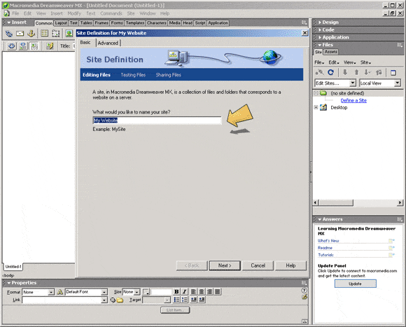 1. Open Dreamweaver and from the main menu 'Site' option, select 'New Site'. A new dialog box will appear.