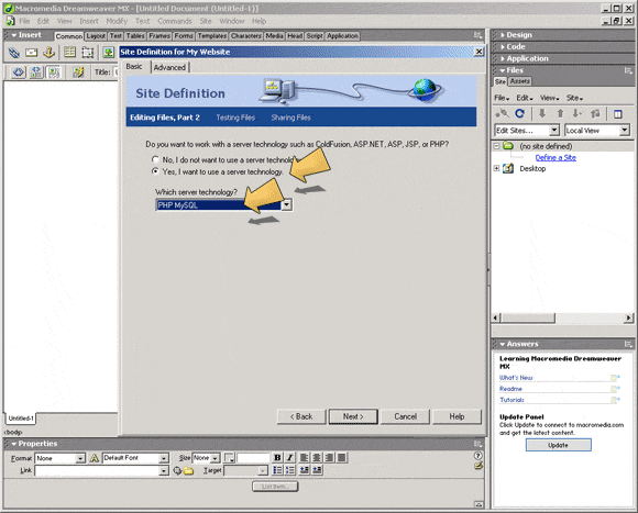 3. Assuming you have Dreamweaver MX for the useful new features such as php/mySQL integration, click the 'I want to use a server technology' radio button & select 'PHP mySQL' from the select box. Click the next button.