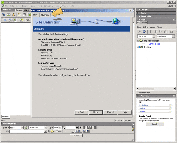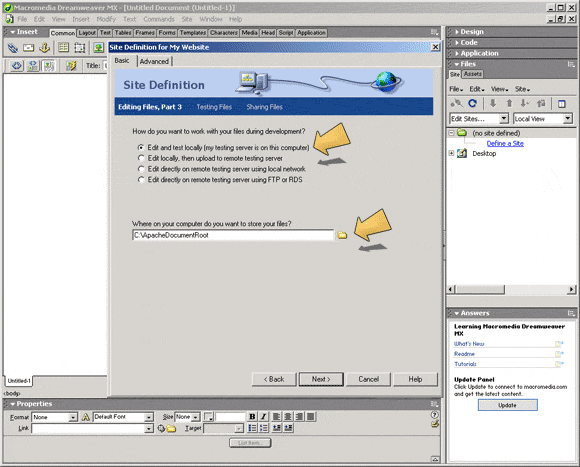 We will setup Dreamweaver MX to use your machine as a test server to develop your website locally. Once finished, Dreameaver will publish your website to our production servers.