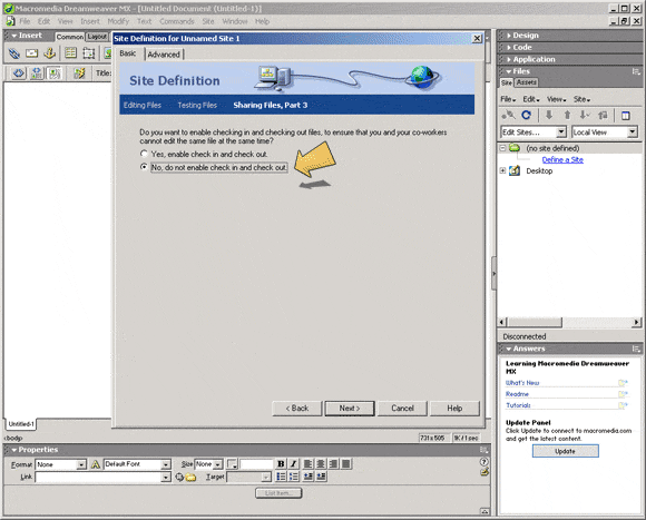 8. Select 'do not enable checkout' if you are the only person editing the files. If you are working simultaneously with other people you might want to enable check-in & check-out. Click next once you are done.