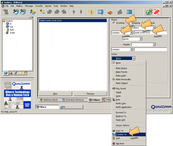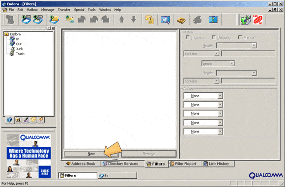Open Eudora and from the drop down menu, click on Tools --> Filters.
