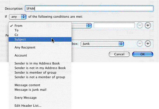 From the Header select box, choose 'Subject'. Select 'contains' from the