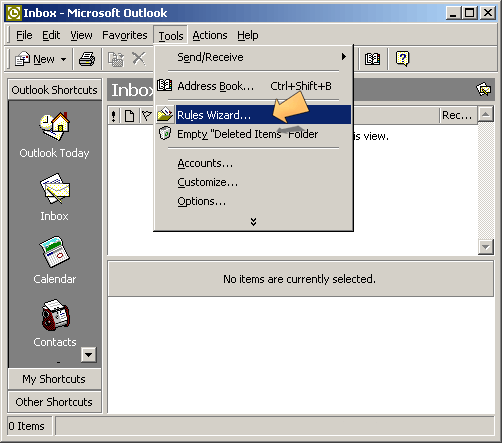 Open Microsoft Outlook and click on Tools --> Rules Wizard...